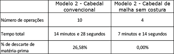 Conforme apresentado na Tabela 2, para a produção dos cabedais convencionais do modelo 2 foram realizadas 10 operações e durante a produção dos cabedais houve descarte de 26,58% de matéria-prima. Os cabedais de malha sem costura do modelo 2 foram produzidos em uma malharia retilínea e foram entregues à indústria calçadista no formato e numeração adequados para serem unidos aos solados. Portanto, não houve necessidade de cortar os cabedais e foram executadas apenas 04 operações para preparação dos cabedais. A quantidade de elástico descartada ao final da peça de 25m não foi considerada no cálculo de desperdício, pois trata-se de um valor residual.