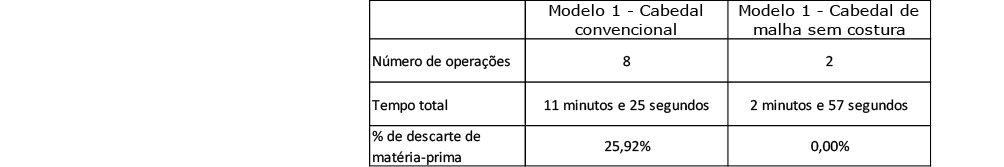 Para a preparação dos cabedais de malha sem costura foram realizadas duas operações: (i) fechamento do cabedal e (ii) colagem e costura do gorgorão. A Figura 5 ilustra as etapas dos dois processos produtivos e a Tabela 1 apresenta os valores experimentais obtidos para cada tecnologia.