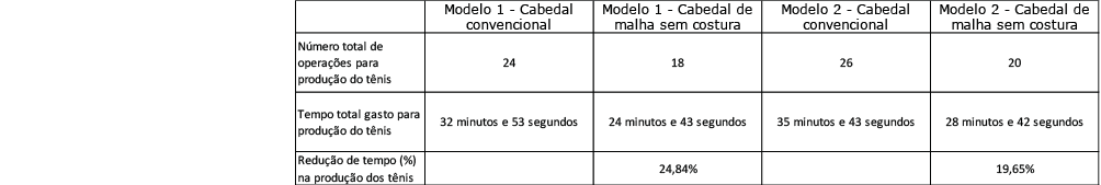 Ao comparar os dois modelos de tênis confeccionados com cabedais de malha retilínea com os mesmos modelos produzidos pelo processo convencional, os de malha retilínea utilizaram um número menor de etapas para a preparação dos cabedais e um tempo menor para executar todas as operações. A redução de tempo total para a produção do modelo 1 foi de 24,84% e para o modelo 2 houve uma redução de 19,65%.