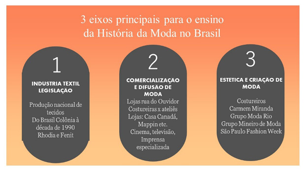 This article proposes an approach to teaching the subject History of Fashion subject in Brazil for fashion design courses. Based on the classroom experience, it was possible to separate the history of fashion from the chronological chain, more commonly used in history subjects, and define a lesson plan based on the most significant events in fashion production in Brazil, since Colonial times. Three main axes were detected: textile production; the commercialization and dissemination of fashion; aesthetics and fashion creators. These axes connect and form a comprehensive content that permeates the entire constitution of Brazilian fashion. Based on these axes, a review of the available bibliography was presented with the main publications in the area relevant to the topics covered, punctuating their contributions to the best use of the discipline.