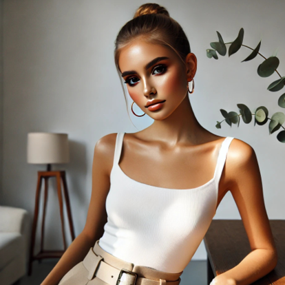 No que se refere aos formantes eidéticos, observa-se a predominância de formas arredondadas, como o canto do sofá, o abajur, as folhas da planta, o vaso de vidro e os brincos de argola. A blusa ajustada evidencia as curvas do corpo, enquanto o rosto da mulher, de formato triangular com maxilar e queixo marcados, apresenta simetria, olhos e boca grandes, nariz pequeno e arrebitado, características associadas a padrões estéticos do Norte Global. A maquiagem é elaborada, com base, corretivo, blush, bronzer, iluminador e gloss, compondo uma aparência polida. Há indícios do uso de filtro, suavizando as texturas da pele e apagando marcas naturais, com exceção das veias discretas na mão esquerda, único traço mais realista. O cabelo está preso em coque alto, com mechas soltas emoldurando o rosto. O look é composto por uma regata branca de malha canelada com alças finas e decote ovalado, e uma peça inferior em alfaiataria de cintura alta, com cós largo, pregas frontais, bolso faca e cinto grosso com fivela retangular. O único acessório é o brinco de argola. As formas triangulares, a simetria facial e a ausência de rugosidade reforçam a construção idealizada do corpo, alinhada aos padrões digitais e estéticos contemporâneos