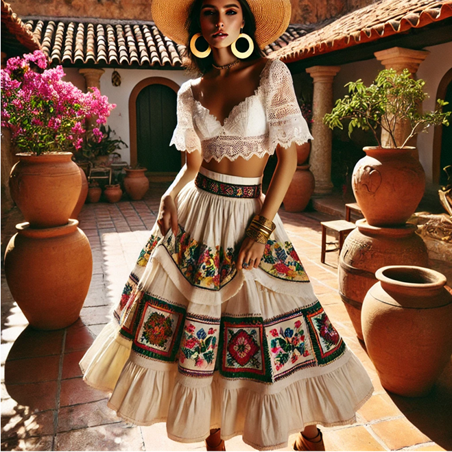 Nesta imagem os formantes cromáticos são compostos por tons terrosos, bege e branco com pontos de tons quentes, como o rosa nas flores, o verde nas folhas e nas portas. As cores presentes no bordado da saia (vermelho, verde, amarelo, verde, rosa, roxo) contrastam com as tonalidades mais neutras da vestimenta e do fundo, sugerindo uma ideia de riqueza cultural e destacando a artesanalidade. Em relação à luminosidade, a imagem apresenta uma luz focal que incide de cima para baixo, como se a origem da luz estivesse no plano de fundo à figura da mulher. É possível identificar que para a resolução/criação das principais cores da imagem e da iluminação conta com a presença do pigmento amarelo.