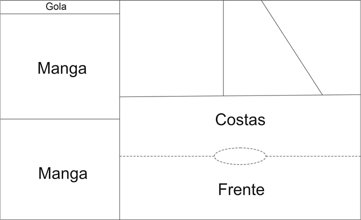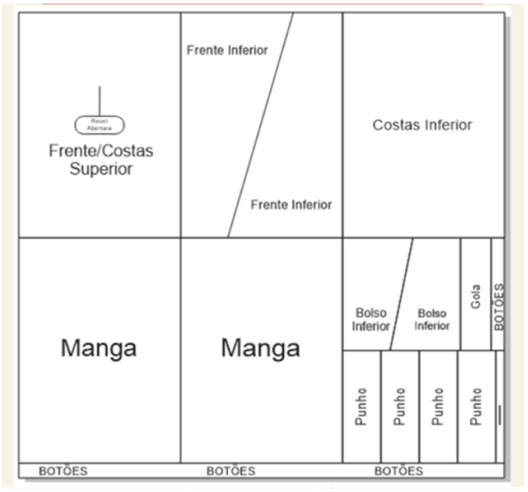 Deste modo o processo foi, então, reiniciado com a criação de um gabarito em papel, respeitando as dimensões exatas do tecido a ser utilizado (1,59m x 1,57m). Sobre esta área, realizou-se o mapeamento estratégico dos módulos retangulares, sempre verificando os limites do material disponível, visando a otimização do corte. Para a disposição das partes dos moldes seguiu-se uma hierarquia funcional, iniciada pelos módulos maiores (tronco) e preenchendo os espaços remanescentes com os componentes menores (mangas, gola, punhos). Esta dinâmica garantiu o aproveitamento integral do tecido.