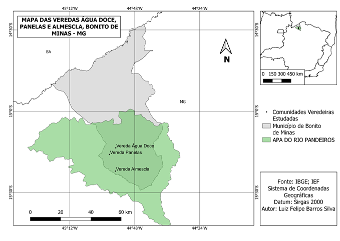 O estudo foi realizado nas comunidades veredeiras da Água Doce (15°13'29.73" S e 44°55'0.28" O); Panelas (15°15'56.03" S e 44°57'20.65" O) e Almescla (15°22'4.14" S e 44°55'8.33" O), inseridas na APA do Rio Pandeiros, no município de Bonito de Minas, Norte de Minas Gerais (Figura 1). O clima, segundo a classificação de Köppen, é do tipo Aw, tropical de savana com inverno seco (Reboita et al., 2015), com a estação seca de maio a setembro e estação chuvosa entre os meses de novembro e janeiro, possui temperatura média anual de 26,8ºC e a precipitação média anual é de 920 mm (Azevedo et al., 2014).