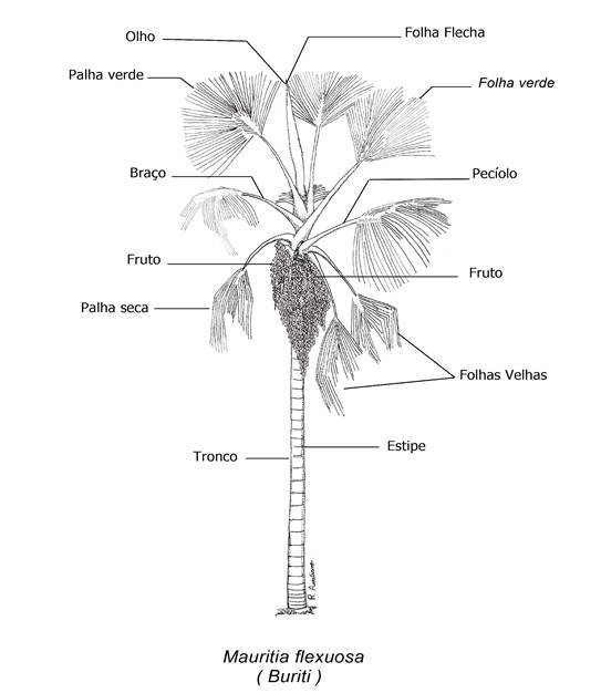 A partir da caracterização local das partes utilizadas dessas palmeiras, foi realizado um paralelo com a caracterização acadêmica de suas partes externas (Figura 3). Assim, as folhas flechas, folhas verdes, folhas secas, pecíolo e estipe são localmente descritos como: olho, palha verde, palha seca, braço e tronco respectivamente, vale ressaltar que essa caracterização tanto é utilizada para M. flexuosa, quanto para M. armata.