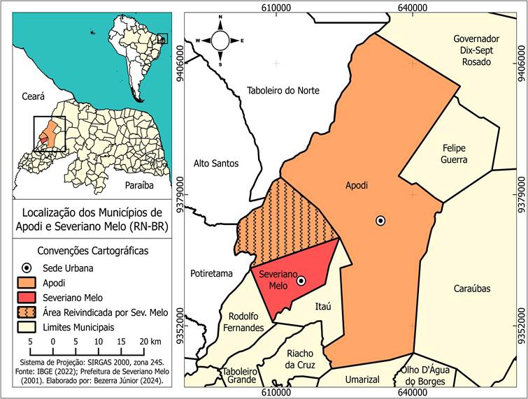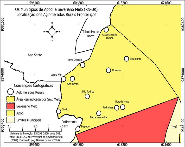 Sobre reconfigurações territoriais, apresentamos a situação dos limites entre os territórios municipais fronteiriços de Apodi e Severiano Melo, ambos localizados no estado do Rio Grande do Norte – Brasil. Os dois municípios disputam uma área localizada na zona rural do município de Apodi, onde estão situados 12 aglomerados rurais, que são: Assentamento Paraná, Venha Ver, Floresta, Bela Fonte, Morada Nova, Baixa Vermelha, Cimão, Sítio Bispado, Pedrinhas, Novo Oriente, São Bento e Sítio dos Padres (IBGE, 2022, 2021).