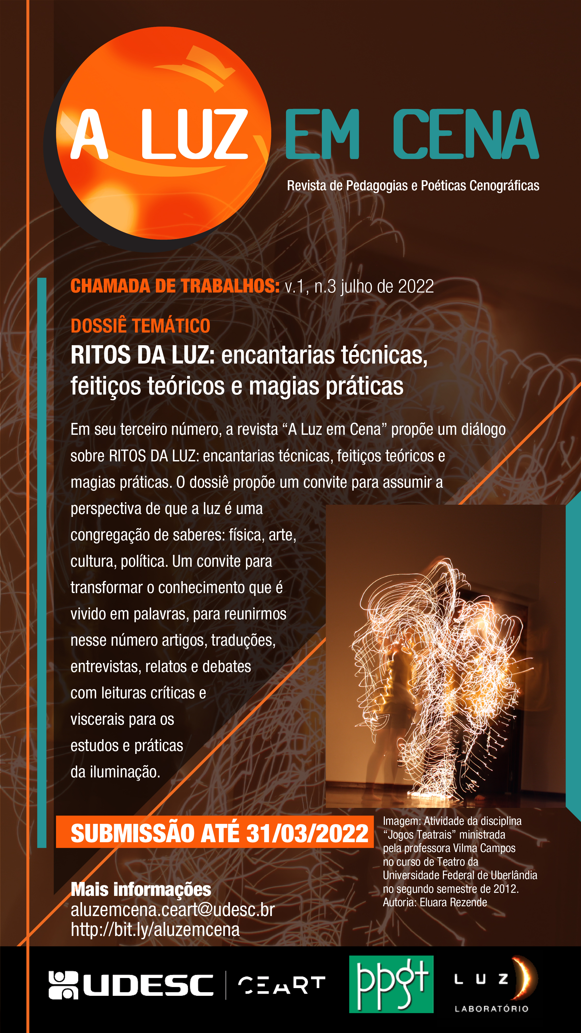 Em seu terceiro número, a revista “A Luz em Cena” propõe um diálogo sobre RITOS DA LUZ: encantarias técnicas, feitiços teóricos e magias práticas. Esse dossiê propõe um convite para assumir a perspectiva de que a luz é uma congregação de saberes: física, arte, cultura, política. Um convite para transformar o conhecimento que é vivido em palavras, para reunirmos nesse número artigos, traduções, entrevistas, relatos e debates com leituras críticas e viscerais para os estudos e práticas da iluminação.