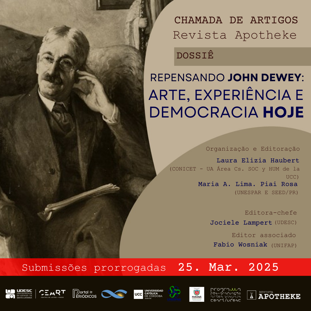 08-12-2020A Revista Apotheke, abordará neste dossiê articulações entre Educação, Artes Visuais e Experiência, considerando as contribuições do filósofo norte-americano John Dewey (1859-1952) para o campo das Artes, da Educação e da Arte Educação, compreendendo o ensino das artes visuais, assim como, artes cênicas e música. A teoria deweyana apresentou e, continua apresentando um novo projeto filosófico para pensar as condições e os valores sociais que envolvem uma ideia de conhecimento próximo às experimentações cotidianas da vida, onde mente e corpo, vida, arte e educação não são compartimentos, mas fazem parte de uma unidade que compõe a vida. Dewey nos convoca a pensar acerca da união das coisas, teoria/prática, arte/vida, educação/vida. Seguindo este pressuposto, o percurso de ensinar e aprender, voltado a uma reflexão crítica, o desafio estaria em romper com a fronteira que distingue a vida das demais coisas, ou seja, recompor essa associação impulsionaria a potência criadora do aprender-da-experiência.