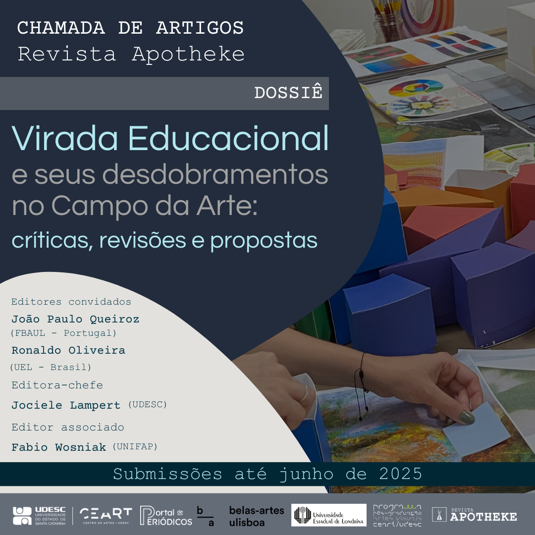 10-01-2024A Revista Apotheke convida professores/as, artistas, pesquisadores/as, acadêmicos/as e profissionais dedicados às artes visuais para se engajarem ativamente na elaboração dos três volumes que comporão o ano de 2024. Durante este período, nossa revista se empenhará em uma investigação minuciosa do tema central "Entre abordagens, métodos e metodologias", buscando dialogar sobre as múltiplas facetas que permeiam o vasto campo das Artes Visuais em articulação com a Arte/Educação.
