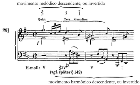[23] “La naturaleza propone solamente desarrollo y generación, un hacia adelante indefinido; pero los artistas, construyendo la relación de quinta en dirección inversa [...] crearon una oposición equivalente; [...] un proceso absolutamente artístico que en el fondo es un fenómeno contrario a la naturaliza [...]. Ésta relación de quinta hacia abajo – relación que yo llamaría involución [Inversión]. [...] Lo que atrajo sobre todo al artista de esta involución fue la sensación de que estaba vinculada a una tensión de alto nivel artístico” (SCHENKER, 1990, p. 78).
