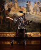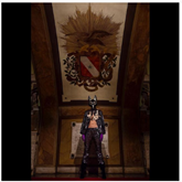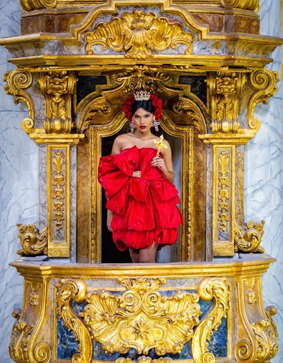 Na modalidade composicional, visualiza-se o vermelho no vestuário e o dourado nos elementos arquitetônicos e decorativos. O material usado no vestido foi um tecido armado para fazer os volumes em camadas. Dessa maneira, a tecnologia do tecido influencia a interação com o contexto da locação escolhida, no caso, a Igreja do Carmo.