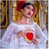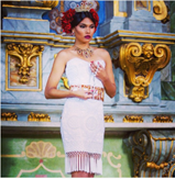 O intuito foi associar o styling e a imagem de moda com as locações externas de Belém, contribuindo para o registro do patrimônio arquitetônico e a interação do indivíduo com os espaços locais na contemporaneidade. De tal modo, o percurso se inicia no centro histórico da cidade, especificamente nas locações Igreja do Carmo e Palácio Lauro Sodré. Ambos os prédios foram concebidos pela estética clássica e art noveau. Inseridos nesses espaços, percebe-se a presença de mulheres que convergem por meio do embelezamento expresso nos tecidos finos, plumas, silhuetas e brilhos (Figuras 4 a, b, c, d, f, g, h, i, j). Especificamente na Figura 4a, que faz parte de uma série de seis imagens na página do Instagram de Carneiro (2014a), ao analisar pela ótica da modalidade do aspecto visual, observa-se o fundo com estrutura de mármore, púlpito brilhoso, uma modelo localizada na região central usa vestido tomara-que-caia, curto, com camadas de volume, um dos braços está para baixo. Como acessório, uma das mãos segura uma cruz na direção do seio, brincos em formato de cruz, coroa e flores na cabeça.