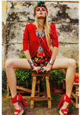 No styling de José (2017), está presente na modalidade composicional a paleta de cores no azul, vermelho, preto, verde e marrom. Os materiais são jeans, brim e malha de algodão. Esses estão presentes respectivamente na jaqueta, short, top e adorno do colo. Todavia, a tecnologia da jaqueta no material jeans e o adorno do colo de malha contradizem a ambiência da imagem acerca do calor que ela transmite.