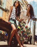 Figura 5 - (a) modelo com vestido longo cinturado e mercado de ferro ao fundo; (b) modelo com look em preto e branco, calça e blusa; (c) modelo sentada com saia longa e fenda; (d) modelo andando com saia longa e fenda; (e) modelos sentadas em um carrinho de frutas de madeira; (f) vestidos listrado e estampado, com chapéu grande; (g) vestido estampado e modelo encostada na parede; (h) vestido estampado e modelo apoiada no carrinho de frutas; (i) vestido estampado e modelo deitada em uma escada de ferro verde]; (j) vestido estampado e colunas de ferro verde ao fundo.