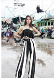 Na modalidade composicional, a paleta de cores é concebida pelo bege, preto, azul e branco. O material usado pode ser uma malha, pois percebe-se os drapeados na cintura e um caimento reto da parte inferior do vestido. Ao adentrar na tecnologia do material, observa-se que ele se adequa ao contexto das temperaturas das capitais localizadas na região amazônica, com clima úmido e quente.