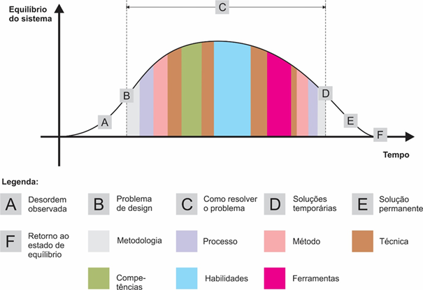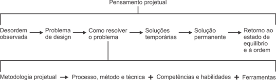 Conforme é possível perceber na Figura 1, o pensamento projetual possui como etapas: (i) desordem observada, (ii) problema de design, (iii) como resolver o problema, (iv) soluções temporárias, (v) solução permanente, (vi) retorno ao estado de equilíbrio e à ordem. A metodologia – que pode ser compreendida como o estudo dos métodos, mas que, aqui, ora substituí o termo método, ora refere-se somente a um método – surge na busca por resolver o problema de design e pode ser decomposta em: (i) processo, método e técnica, (ii) competências e habilidades, e (iii) ferramentas.