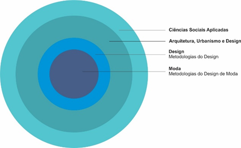 Para Aguiar (2015, p. 10), “a área de moda passou a ser avaliada como um conhecimento que compõe a matriz curricular da área do design”, o que denota a vinculação entre ambas na compreensão do Ministério da Educação (MEC). A autora cita que, também a área de design está vinculada ao grande campo de avaliação de Arquitetura, Urbanismo e Design, e que este, por sua vez, pertence às Ciências Sociais Aplicadas – conforme ilustra a Figura 2 deste artigo.