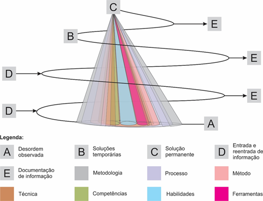 Após estruturado, percebeu-se que o modelo gráfico 1 (Figura 3) não contempla, explicitamente, os fatores: problema de design e retorno ao estado de equilíbrio. Subentende-se que, o problema de design inicia a formação da estrutura cônica, pois impele ação à desordem até então somente observada; e o retorno ao estado de equilíbrio ocorre no topo da estrutura, quando se confirmada a solução permanente.