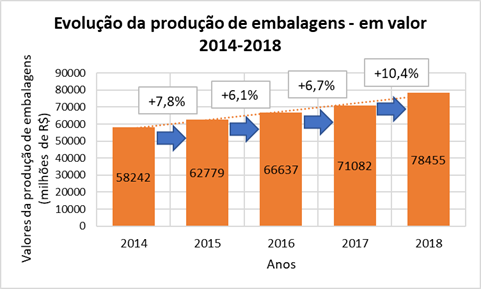 A Associação Brasileira de Embalagens (ABRE) realizou uma análise do valor bruto de embalagens produzidas em 2018, e constatou que houve uma movimentação de R$ 78,5 bilhões, o que representou um crescimento de 10,4% em relação à 2017. Estimou-se que plásticos, embalagens celulósicas e metálicas representaram aproximadamente 90% do montante total (ABRE, 2019). O Gráfico 1 representa este aumento na produção entre os anos de 2014 e 2018.