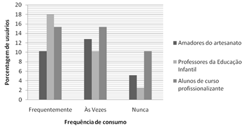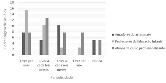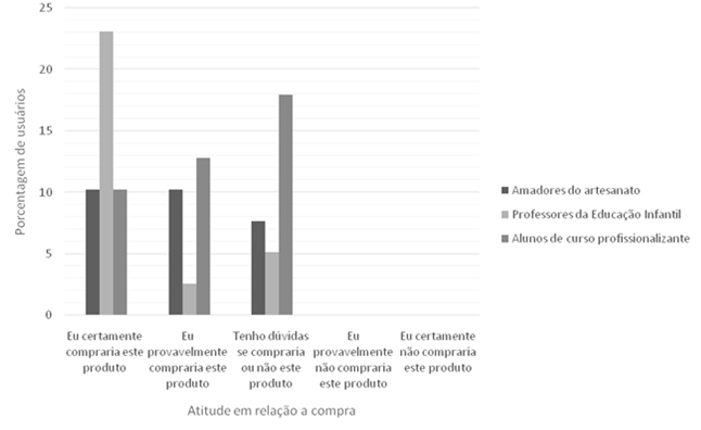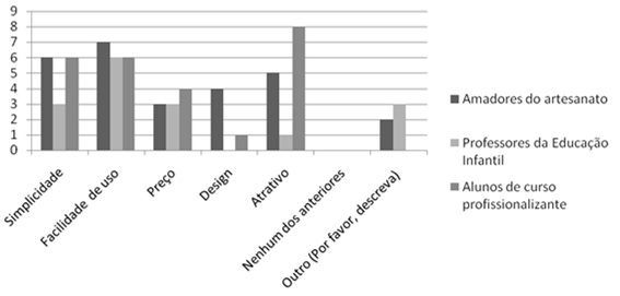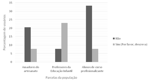 Na etapa seguinte (desenvolvimento e teste de conceito) foi realizado um questionário submetido a três parcelas da população: professores da Educação Infantil, alunos de curso profissionalizante e amadores do artesanato. Dessa forma, foi possível elaborar gráficos com os dados obtidos e comparar as respostas.