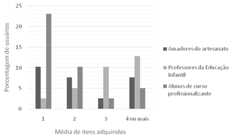 A terceira pergunta, “Quantos itens você adquire, em média, em cada compra?” apresentou como resultados os dados contidos no Gráfico 4. Com esta análise conclui-se que os alunos do curso profissionalizante representam uma parcela que adquire menos itens por compra, com o percentual de 23,08%. Os professores da Educação Infantil que adquirem de quatro ou mais pincéis a cada compra representam 12,82% da parcela total de entrevistados.