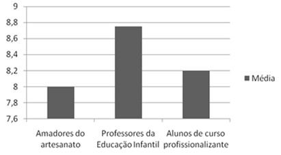 Ao considerar que os professores da Educação Infantil apresentaram boa aceitabilidade, que adquirem grande quantidade de produtos em cada compra e os adquirem com frequência, foram a parcela que melhor avaliou o “Pincel Troca Cerdas”, sendo sua média de modo isolado em 8,75. Em seguida, a média dos alunos do curso profissionalizante ficou em 8,2 e dos amadores do artesanato em 8,0. A média geral de todos os analisados ficou 8,3.