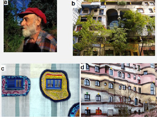 Figura 1. Friedensreich Hundterwasser (a) e as fachadas de seus prédios inspirados na natureza (b), cujas janelas (c, d) expressavam a identidade da pessoa que ali vivia