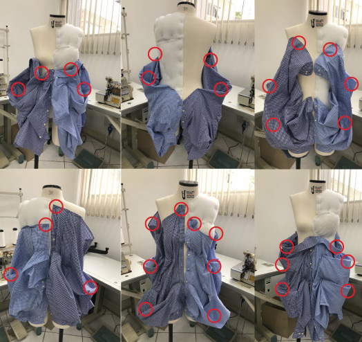 Como foco de estudo, priorizou-se peças de reaproveitamento descartadas semelhantes para que a comparação posterior do estudo fosse considerada apenas pela volumetria corpórea e não por mudanças estéticas referentes às peças escolhidas. Dessa forma, encontra-se nos experimentos visuais duas camisas sociais masculinas de mesmo tamanho, padronagem e tonalidade de cor. Da mesma forma que a escolha pela técnica de drapear – técnica de representação artística em bustos – ocorreu pelo objetivo de potencializar os experimentos de uma maneira mais livre e autoral. Para a criação das formas e volumetria dos tecidos com essa técnica, considerou-se aplicar os alfinetes consecutivamente em ambos os lados, para que os mesmos, fossem colocados nas mesmas regiões só que nos lados do corpo opostos, e essa decisão também foi baseada na comparação final das experimentações.