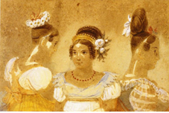 Ao contrário da Europa, praticamente não há o emprego de perucas entre as senhoras brasileiras. “Os viajantes, que aqui passaram pela época, são unânimes em afirmar que os nossos avós, em geral, andavam higienicamente de cabeleiras naturais, acrescentando (o que convém saber): muito limpas, muito cuidadas” (EDMUNDO, 2000, p. 216, grifos do autor). Dentre os acessórios que complementam a toilette feminina estão luxuosas joias – colares, brincos, braceletes, tiaras, etc. –, largamente retratas por Debret em suas aquarelas. Aqui apreciamos no colo da figura central um exemplo dessas peças, um colar confeccionado com pedras preciosas. A mesma jovem exibe ainda uma larga tiara de metal nobre, que junto com um ramalhete de flores ornamenta o seu penteado.