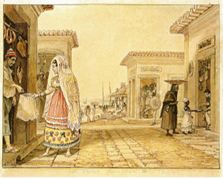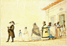 Os detalhes que compõem a toilette de uma abastada senhora ao sair de casa também são registrados por Debret na aquarela Vendedor de flores e de fatias de coco (Figura 4).