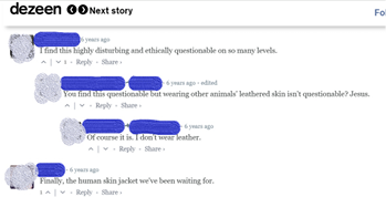 Identifica-se acima comentários de internautas que interagiram com a reportagem na página de conteúdo sobre design e tendências da revista Dezeen (cujos nomes e fotos foram ocultados para fins de pesquisa). A primeira internauta diz que acha isso “altamente perturbador e eticamente questionável em muitos sentidos”; uma segunda internauta diz “Você acha isso questionável, mas vestir couro de animal não é questionável?” e a anterior afirma que ela não veste couro, justamente por achar questionável; um terceiro internauta diz ironicamente ou não “Finalmente, a jaqueta de pele humana pela qual estávamos esperando” (Tucker, 2016, n.p., tradução nossa).