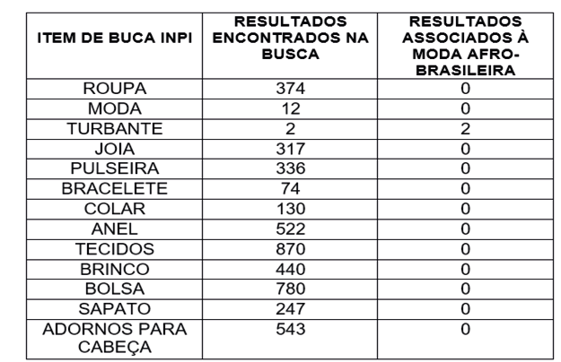 Os únicos 2 (dois) itens próximos do que seria voltado à moda afro, foram turbantes que puderam ser caracterizados pela própria nomenclatura. No entanto, o pedido de nº DI6101137-1, depositado ao dia 02/02/2001, com título de “turbante” teve que reformular o título e as fotos que foram enviadas para se enquadrar nos requisitos do INPI para obter a concessão do registro, mas foi extinto em 03/02/2006 por falta de pagamento da guia de recolhimento referente a renovação da concessão do registro.
