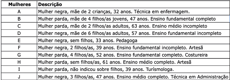Cabe ressaltar que durante a entrevista narrativa não houveram questionamentos diretos sobre raça/etnia, a identidade racial foi algo que emergiu de suas falas, especialmente notada, no entendimento delas, para a justificativa sobre a falta de oportunidade no mercado formal. As entrevistadas foram nomeadas por letras em organização alfabética na ordem da realização das entrevistas, conforme a tabela abaixo: