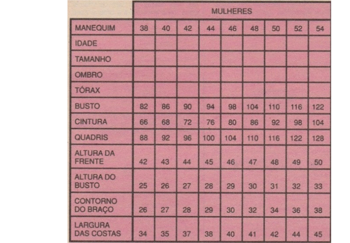 Thus, even though Revista Manequim expanded the measurement chart up to size 62, in terms of circumference, the larger sizes have lost centimeters starting from size 54, while the smaller sizes from 36 to 50 have gained some centimeters.