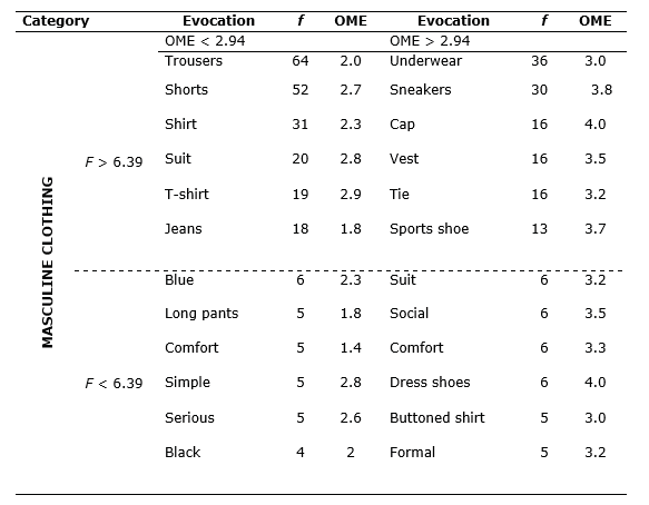 In Table 1, it is possible to see that the main elements of the social representations about “masculine clothing” for the participants are strongly associated with the words “pants”, “shorts”, “shirt”, “suit” and “t-shirt”. These words, located in the first quadrant of Table 1, constitute the Central Nucleus (CN) of the social representation of the phenomenon in question for the sample, that is, they structurally present the notion most strongly shared by the group and the words with the highest frequency.