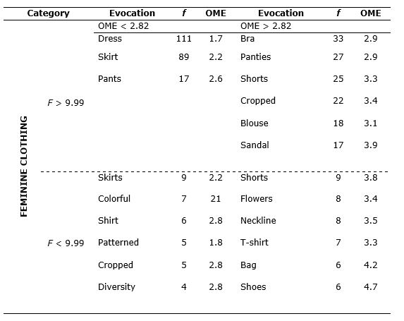 In the Peripheral Zones, located in the second and fourth quadrants of Table 2, words emerged that illustrate the representation of feminine clothing for the respondents. In the first periphery, in the second quadrant, the words “bra”, “panties”, “shorts” and “cropped” are located, since they are the most evoked. In relation to the second periphery, corresponding to the fourth quadrant of Table 2, the words with the highest frequency were: “shorts”, “flowers” and “neckline”.