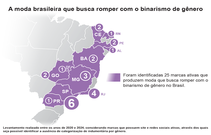 Apontamos que, apesar da multiplicidade de termos, a moda que desafia os padrões binários de gênero não parece ter facilidade em se estabelecer no Brasil. Durante o período do levantamento, entre 2014 e 2024, 6 marcas que haviam sido identificadas inicialmente pausaram ou encerraram definitivamente suas atividades, e por tanto foram retiradas do mapeamento. Um número reduzido de marcas que trabalham exclusivamente neste mercado foi identificado, sendo 25 empresas distribuídas por quase todas as regiões do país (Figura 2).