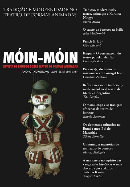The readers are free to transfer, print and use the articles published in the Magazine, as long as there’s explicit mention to the author(s) and to Móin-Móin Magazine - Studies in Theater of Animated Forms and there are no changes on the original work. Any other use of the texts needs to be approved by the author(s) and the Magazine. In submitting an article to Móin-Móin Magazine - Studies in Theater of Animated Forms and have it approved, the author(s) agree to give away, without payments, the following rights to the Magazine: first publishing rights and the license for the Magazine to redistribute this article and its metadata to index and reference services that the editors consider appropriate.