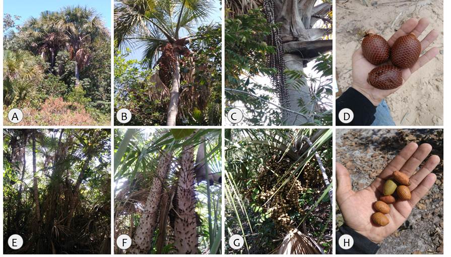 Figura 2 - Buriti (M. flexuosa) e Buriti bravo (M. armata) nas veredas do norte mineiro. A) Buritis na vereda Água Doce. B) Indivíduo de Buriti com frutos. C) Indivíduo pós dispersão dos frutos. D) Frutos de Buriti. E) Buriti bravo na vereda da Almescla. F) Estipes armados com espinhos de Buriti bravo. G) Indivíduo de Buriti bravo com frutos. H) Frutos de Buriti bravo.
