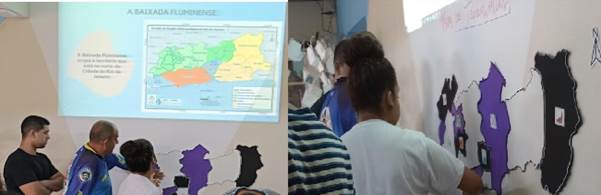 Na sequência, os residentes realizaram uma apresentação expositiva sobre os significados toponímicos dos municípios da Baixada Fluminense (Figura 3), com base em fontes secundárias (sites Brava Baixada, Prefeituras Municipais, Biblioteca IBGE e Baixada Fácil), a fim de contextualizar historicamente a formação dos territórios e ampliar o repertório dos alunos. Posteriormente, os estudantes foram organizados em grupos e orientados a selecionar e desenhar símbolos e ícones que representassem os significados históricos e culturais de cada município, compondo de forma colaborativa a legenda do mapa. Por fim, com a supervisão dos residentes, os alunos montaram o quebra-cabeça na parede e, com base na legenda construída, compuseram coletivamente o mapa participativo das toponímias da Baixada Fluminense. Essa construção coletiva possibilitou a articulação entre teoria e prática, promovendo o protagonismo discente e a apropriação crítica do território representado.