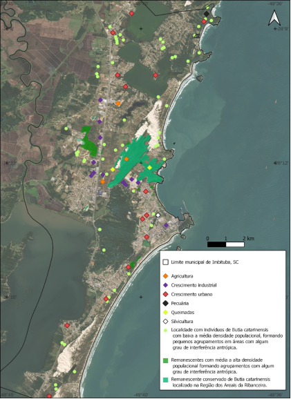 Butia palm groves are ecosystems where palm trees of the genus Butia predominate. The south-central coast of Santa Catarina and the northern region of Rio Grande do Sul are home to the species Butia catarinensis, which is considered endemic and threatened with extinction. Butia palm groves have historically been managed and utilized by local communities and are products of socio-biodiversity. The aim of this study was to identify the main threats to Butia palm groves and to analyze their conservation within Imbituba's legal provisions and territorial planning instruments. The methodology included a participatory mapping workshop of the areas where Butia palm groves are present and have been suppressed, an analysis of legislation and territorial planning instruments, and interviews with representatives of the local community, institutions involved in the Butia palm grove issue, and the municipal government. Urban and industrial growth was identified as the main threat to Butia ecosystems, and despite the existence of legal protection provisions, these are often neglected in territorial planning and management.
